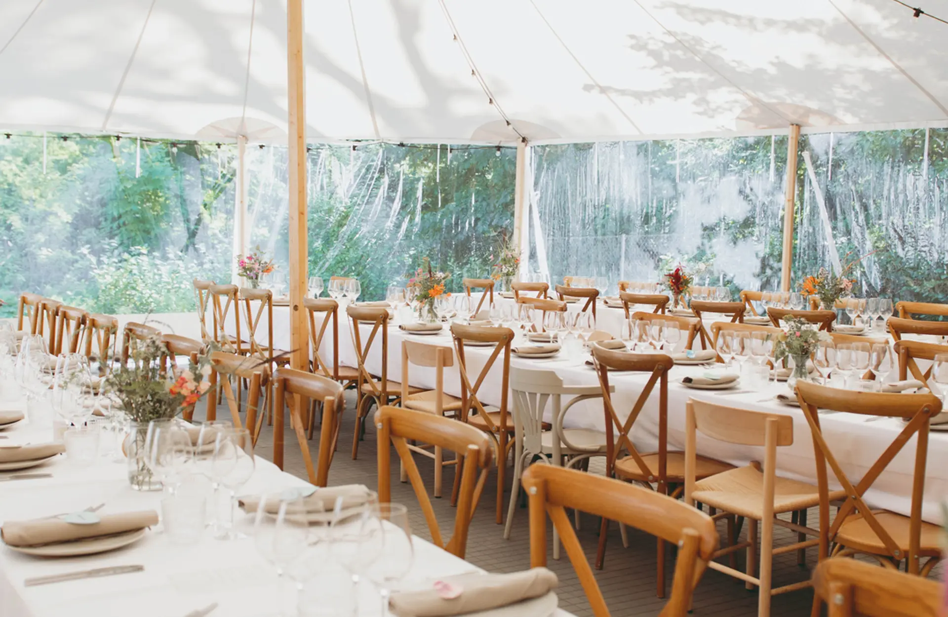 Ved bryllupper, fødselsdage, sommerfester eller andre større arrangementer er det muligt at leje hele gården. Vi sætter et speciallavet stoftelt op i haven med plads til 70 personer, hvor I kan nyde middagen.